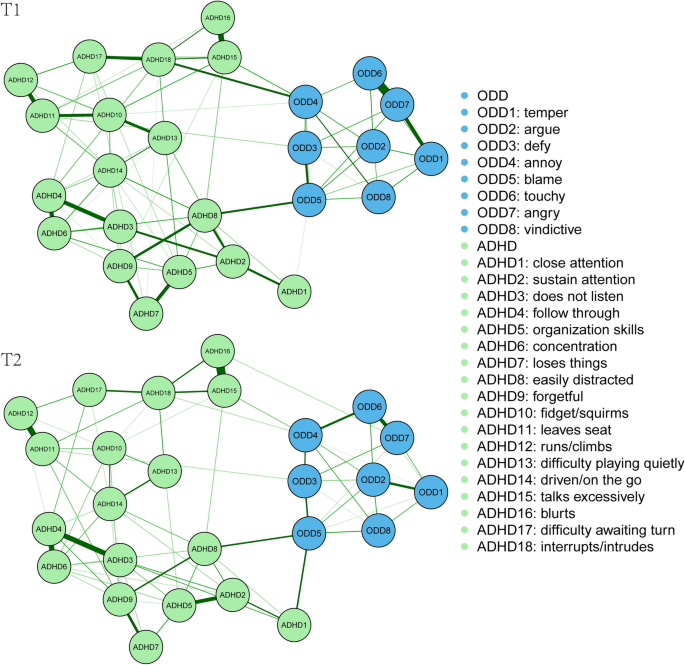 至今为止,有两种主要的理论观点被用来解释ODD和ADHD的共病发生。相关风险因素模型(correlated risk factors model)认为ODD和ADHD共病是由某些相关或共享的危险因素所引起的,而发育前兆模型(developmental precursor model)则认为是ADHD导致了ODD的发生。近年来得到广泛关注的心理障碍的网络理论提出,心理障碍的症状会发生传播:具有一种障碍的某些症状会使一种障碍面临患其他障碍的风险,从而产生共病。基于此,本研究将从症状水平,探索ODD和ADHD症状之间的联系。 横断网络和交叉滞后网络分析(cross-lagged panel network analysis,CLPN)结果发现:ODD和ADHD共病的症状网络是跨时间稳定的;ODD症状中的“经常主动惹恼他人(annoy)”和“自己有错误或不当行为却经常指责他人(blame)”是ODD和ADHD症状网络之间潜在的桥梁症状;ODD症状可能导致ADHD症状网络的激活,ADHD症状也可能导致ODD症状网络的激活。 上述结果提示,在症状水平上,发育前兆模型可能部分解释了ODD与ADHD共病的机制,未来的研究应进一步探讨潜在的多重机制。同时,本研究结果具有一定的临床意义,不仅强调了对现有儿童心理病理诊断标准进行优化的必要性,而且为儿童典型心理问题的预防与干预提供了一定的参考。