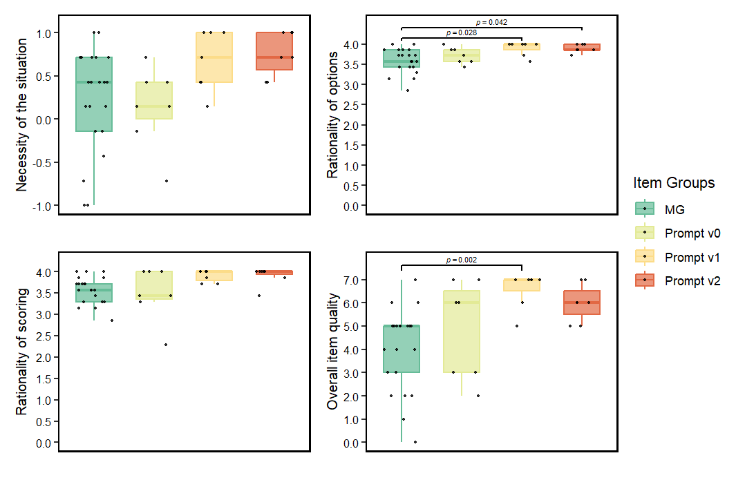 该研究首先聚焦于技术参数与提示词策略的优化,发现通过设置合理的温度参数(如 Temperature = 1.0)并采用经过多轮迭代优化的结构化提示词,GPT-4能在创造力与准确性之间达到最佳平衡,并生成语义丰富、逻辑严密的测试情境。这一优化过程不仅保证了题目情境的多样性,更有效规避了以往研究在生成复杂情境题目时容易出现的评分逻辑错误,显著提升了生成题目的内容效度。