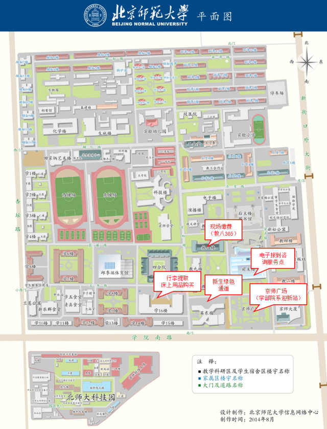四、报到事宜 1. 报到时间 (1)本科、学术硕博报到安排: 9月3日(周六)7:00-14:00,请在规定时间报到,如7点前到校可先行去宿舍楼办理入住后再来迎新站。 如本科、学术硕博无法在以上指定时间完成报到注册(如14点后抵校,或因疫情滞留家乡等),可待9月5日起工作日前往相应办公地点办理(本科、心理硕博-后主楼1404、后主楼1430;国重硕博-英东楼422)。 已经在昌平入住的硕博连读新生,可先暂缓报道注册,待可返回本部后前往本部相应办公室办理。 (2)专业硕士报到安排: 9月2日9:00-14:00、9月3日10:00-14:00,在金丰和办理注册手续,具体以MAP中心通知为准。 2. 报到流程 (1) 入校 海淀校区从大东门、大西门、广场西南门入校,昌平校区从北门入校。全程要戴口罩,保持一米间隔排队入校。测体温、检查核酸检测报告、扫“入校码”,无异常者方可入校。入校后第一时间在木铎的西北侧、大西门、大东门做一次核酸。送学生的车辆和家长、亲友一律不得入校。 (2) 办理报到注册手续 本科生:京师广场“成人视频 迎新站”报到领取材料 → 后主楼1318提交户档组织关系材料 → 宿舍楼办理入住手续 学术硕博(非国重):京师广场“成人视频 迎新站”报到领取材料 → 后主楼1318提交户档组织关系材料 → 宿舍楼办理入住手续 学术硕博(国重):京师广场“成人视频 迎新站”报到领取材料 → 英东楼办理提交户档组织关系材料 → 宿舍楼办理入住手续(具体以国重通知为准) 专硕:9月2日、3日在金丰和办理手续。 (下图为在昌平住宿学生办理入住流程,如7:00-14:00能在本部完成报到注册,可乘坐校车前往昌平校区;如14:00之前无法抵达本部办理报到注册,可直接自行前往昌平校园办理入住,先暂缓报道注册,待可返回本部后前往本部相应办公室办理。)