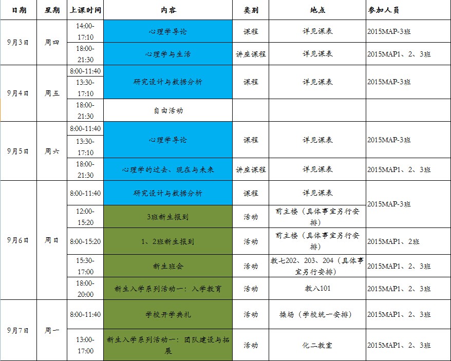 2015级MAP新同学: 你好!现将新生开学报到安排及3班9月集中授课安排通知更新如下,请仔细查看(此通知已于8月底通过邮件推送),并按时参加各项活动。 2015级MAP新生入学系列活动安排及北师大校园平面图附在附件中,供参考! 来校途中,请注意安全,祝一切顺利!如有疑问,请咨询58808272王老师,58802743张老师。 附件1: 2015级MAP新生入学系列活动安排 //crsplive.net/www/index.php/Web/xiazai/tid/250 附件2:北师大平面图 /www/wwwimg/Uploads/files/3.jpg