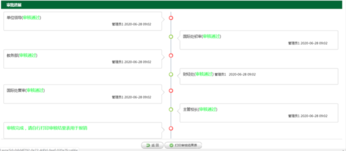 三、审核通过,打印审核结果表 审批通过后会收到一封“国际交流与合作处”的确认邮件。按照邮件要求,在系统中自行打印审核结果表作为校内报销凭证,打印路径:学生因公出境网上审批系统——个人出访申请——已通过申请——点开需打印的行程记录——下滑至页面底部——打印审核结果表。