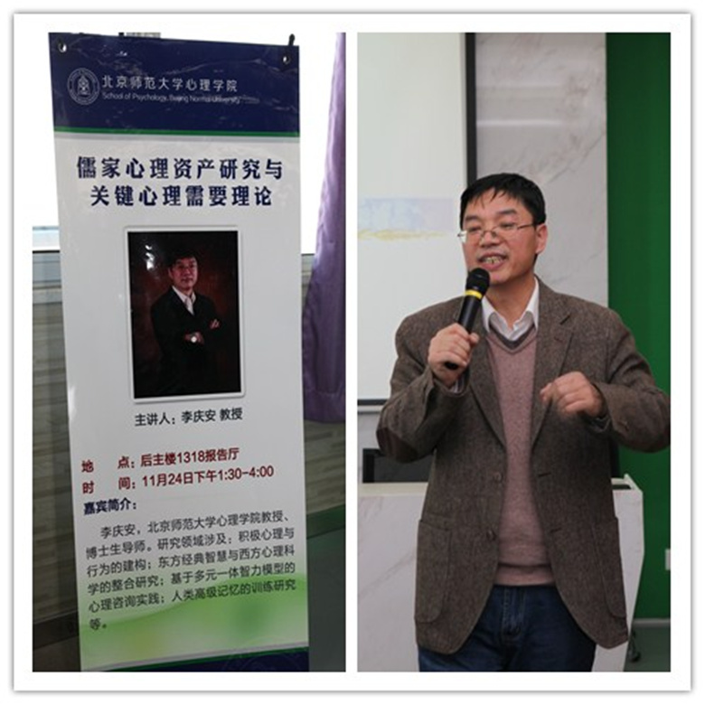 2014年11月24日下午,在北师大心理学院2014级应用心理专硕(MAP)11月份的课程走向尾声之际,学院荣幸地有请到北京师范大学心理学院博士生导师李庆安教授,为2014级MAP学生呈上了一场关于“儒家心理资产研究与关键心理需要”的精彩讲座。李庆安教授的研究涉及积极心理与行为建构、东方经典智慧与西方心理科学的整合研究、基于多元一体智力模型的心理咨询实践以及人类高级记忆的训练研究等领域,并且出版了畅销书籍《破解快速记忆之谜:记忆与智力研究新概念》和《论语管理素质编码手册》。 图一北京师范大学心理学院李庆安教授为2014级应用心理专业硕士(MAP)EAP方向班学生做“儒家心理资产研究与关键心理需要”主题讲座