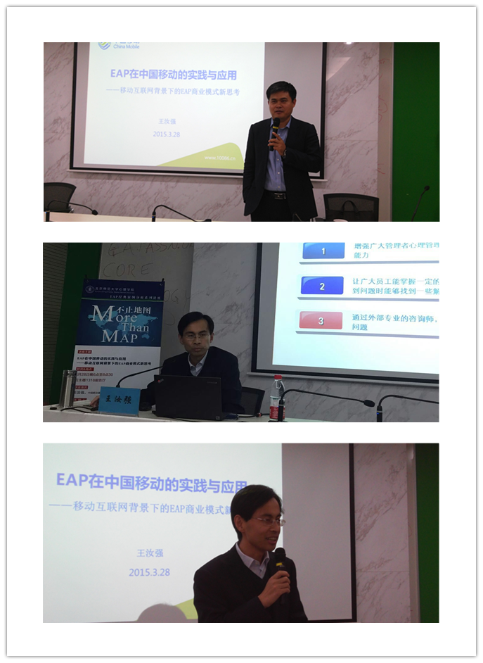 2015年3月,在这个春暖花开的一年伊始,在这个适于汲取新知识的新学期,北京师范大学心理学院2014级应用心理(EAP方向)专业硕士迎来了一次新的感受企业EAP新动态的机会。28日晚,中国移动通讯集团公司党群工作部直属党委办公室副主任王汝强先生为同学们带来了一场主题为《EAP在中国移动的实践与应用——移动互联网背景下的EAP商业模式新思考》的分享讲座。本次讲座由心理学院副院长张西超老师主持。张老师热情介绍王汝强主任是北师大2004届校友,具有8年EAP从业经验,是EAP工作推动者和实践者。本次公益讲座的行程既是他对师弟师妹们的关心,也是对母校的回馈。王主任开场就以师兄的口吻亲切地和同学们打招呼,接着就中国移动EAP项目的探索和发展,国内EAP项目的引入和实践,挑战和问题,机遇和展望这几个方面侃侃而谈,并与与会同学进行了深入交流。 图1:王汝强学长为2014级应用心理专硕学生分享EAP实战经验、张西超老师担任本场主持人 王主任从四个部分分享了他对EAP项目在企业推动与运营的感受与经验。第一部分是从EAP项目在移动公司开展的背景、引入、指导方针、推动模式、项目定位、推动进程和成效等方面对中国移动EAP项目进行梳理和分享。他认为,中国EAP的发展看似偶然,实则必然。 EAP对中国的影响,不仅再于EAP本身,更是EAP以人为本理念给人传达的力量。第二部分则客观中肯地探讨了中国EAP十五六年中的迅速发展,目前存在的问题以及解决方向和途径。他认为EAP在规范性、说服力和市场竞争中都有提升的空间。同时他也指出,中国企业EAP有着散落在不同职能中的定位,而他也相信中国企业EAP最终回归其本身。第三部分中,王主任谈到了移动互联网为EAP带来新机遇,并在第四部分设想了EAP与移动互联网的结合模式,从大设想到小细节都显示出了王主任对EAP事业的重视和期待。 王汝强主任精彩的演讲内容和风趣幽默的演讲风格感染了在场的每一位同学,大家非常珍惜与王主任难得的交流机会,场下掌声此起彼伏,提问争先恐后。王主任真诚建议同学们走向实践,发展人脉。与此同时,他和张西超老师都表示愿意对同学们在EAP上的职业发展给予帮助和支持。活动最后,为了感谢王主任的无私倾授,张西超老师代表同学们送上礼物。 图2::2014级应用心理专硕学生与主讲嘉宾互动 同学们对王主任在EAP中的认识和成绩表示钦佩,也敬佩他的真诚和客观,更被他的思想深深启发和感动。在演讲的过程中,王汝强主任不断强调2014级应用心理(EAP方向)专业硕士就是中国EAP的黄埔一期,话语之中尽显深厚的期望。他说:“EAP人要有梦想,万一实现了呢?”EAP班级的同学们有良师的引领,有前辈的指导,有益友的支持,今天迈进了EAP的大门,明天也会坚定地走好EAP的大路。