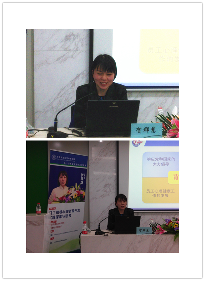 2015年2月27日,北京师范大学心理学院2014级应用心理(EAP方向)专业硕士迎来节后第一天的课程,在完成了一天繁忙的课程后,学院有幸邀请到中国海洋石油总公司思想政治工作部副书记、团委书记贺群慧女士为学生呈上了一堂主题为“员工积极心理资源开发实践探索与思考”的EAP实操讲座。该讲座为心理学院为2014级应用心理(EAP方向)专业硕士学生专门设置的EAP经典案例分析系列讲座的首场讲座,并且该系列讲座还会持续邀请经验丰富的业内人士为学生进行深度分享。 图1:中海油总公司思想政治工作部副主任、团委书记贺群慧女士 为北师大心理学院应用心理专硕(MAP)2014级分享EAP企业实践的相关经验