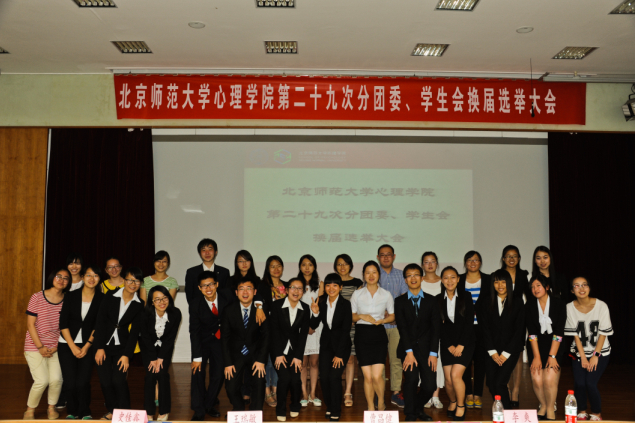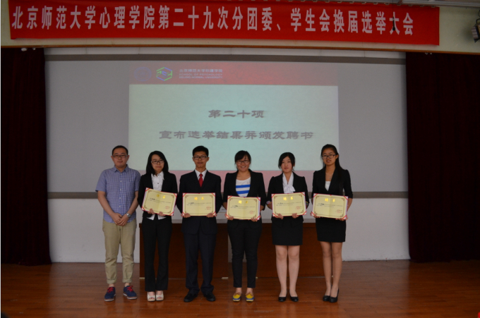 2014年6月7日,心理学院第二十九次分团委、学生会换届选举大会在教九502教室隆重召开。校团委副书记韩舰老师,心理学院分党委副书记王瑞敏老师,心理学院分团委书记曹昌健老师,地理学与遥感科学学院分团委书记倪佳琪老师,生命科学学院分团委书记刘芳南老师,信息科学与技术学院分团委书记奚琦老师,法学院分团委书记肖凡老师,校学生会副主席刘金同学,心理学院分团委李爽老师、史佳鑫老师、张丽霞老师以及各院系学生代表出席大会,全院200余名同学参加大会。大会由心理学院学生会副主席危胜男同学主持。 晚六时,大会开幕,全场起立,高唱《中华人民共和国国歌》。 首先,校团委副书记韩舰老师致辞。他在致辞中充分肯定了心理学院分团委、学生会一年以来的工作,并向大会的召开表示热烈的祝贺。随后,心理学院分党委副书记王瑞敏老师致辞。王老师在致辞中向大会的召开表示热烈的祝贺。她高度评价了心理学院分团委、学生会过去一学年中在引导学生思想、服务同学成长、繁荣同学日常生活、构建和谐校园等方面开展的大量卓有成效的工作,进而向团学干部提出要求,鼓励团学干部发挥自身创造力,发扬开拓精神,将学院经典活动品牌化、优势化。接下来,刘金同学代表校学生会致辞,表达了对新一届团学工作领导班子的期许。 心理学院学生会副主席毋梦薇同学代表筹委会向大会做了筹备情况报告。分团委副书记王波同学、学生会主席陈美玲同学分别向大会报告了2013-2014学年分团委和学生会的工作情况。 报告结束后,大会进入选举环节,分团委、学生会候选人依次进行竞选演讲并接受在场同学们的提问。随后,在总监票人周诗怡同学的主持下,在场全体同学进行了无记名投票。大会计票期间,刘庆芳同学向大会做了学生提案报告。之后,大会对心理学院13-14学年第二学期的优秀干事进行了表彰,分团委李爽老师、史佳鑫老师向心理学院新一届院刊主编、心理学社社长颁发了聘书。 计票结束后,总监票人周诗怡同学宣读了计票结果,分团委书记曹昌健老师宣布了选举结果,大会选举产生了北京师范大学心理学院第二十九届分团委副书记张文菊、学生会主席团成员张笑然、邓孟迪、李小红、闫梦格。随后,曹昌健老师向心理学院新一届分团委副书记、主席团成员颁发了聘书并进行了总结性发言。曹老师在发言中对心理学院全体同学、老一届学生干部以及支持学院学生活动的各位老师表达了感谢,同时对新一届的学生干部给予了厚望。最后,在曹老师的带领下,心理学院老一届学生干部向在场所有同学集体鞠躬表示感谢,现场响起了热烈的掌声。 在掌声中,本次换届选举大会圆满结束。新一轮的学生工作即将开始,我们相信,在新一届学生干部的努力下,心理学院的团学工作将会越来越好!