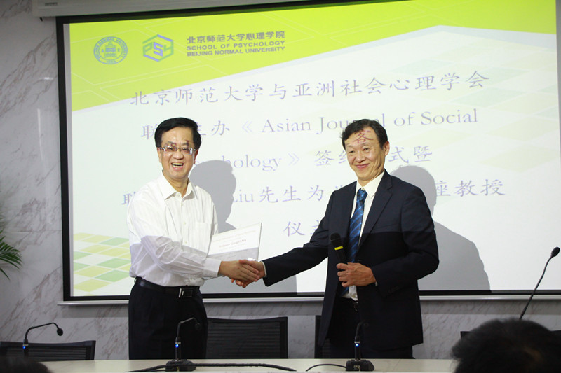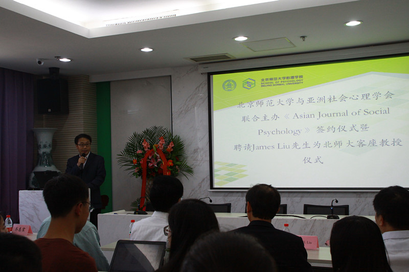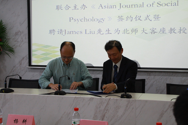 9月24日,我校与亚洲社会心理学会联合主办《Asian Journal of Social Psychology》签约仪式暨聘请James H. Liu先生为我校客座教授仪式在心理学院成功举办。副校长杨耕,心理学院院长刘嘉,副院长刘力,分党委书记乔志宏等出席了仪式,仪式由乔志宏老师主持。 心理学院乔志宏书记担任会场主持 刘嘉院长与James H. Liu先生签约 James H. Liu教授向杨耕教授颁发了资深主编的聘书 杨耕教授为Jams Liu 颁发北师大客座教授聘书 杨耕副校长在签约仪式上致辞