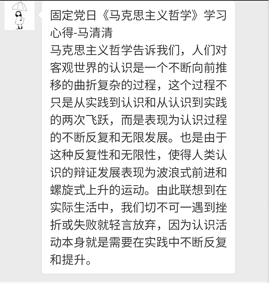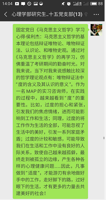 2018年11月21日,研究生第十五党支部于北京师范大学心理健康服务中心举办了“学习《马克思主义哲学》”固定党日理论学习活动。本次活动的主要议程包括以下3个: 1.学习《马克思主义哲学》主要内容; 2.现场分享对《马克思主义哲学》的学习感悟; 3.将感悟汇成文字分享于党支部学习交流微信群。 党员们在结对认真学习《马克思主义哲学》 党员郭小鸾同志正在结合自己所学对《马克思主义哲学》中的观点进行分享 在本次固定党日——学习《马克思主义哲学》议程中,各位党员结合自己当下所学、所思、所感以及当初考取研究生时对此理论的深入学习与理解纷纷发表自己的见解和感悟。如“生产力与生产关系的对立统一”、“矛盾是事物发展的动力”、“度的含义及其重要性”、“对客观环境的认识是一个不断推进的曲折复杂的过程”、“自由是主客体统一的集中表现和最高形式”等。 本次固定党日活动的举办,不仅巩固了党员们对马克思主义哲学的认可,同时也是一个个机会——使得各党员结合理论及自身经历进行了深入的交流和分享,在学习的同时从他人经验中积累经验和教训,对日后党员们的学习和工作具有指导意义。 来源:成人视频 研究生第十五党支部 侯利杰 |