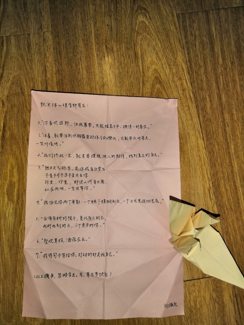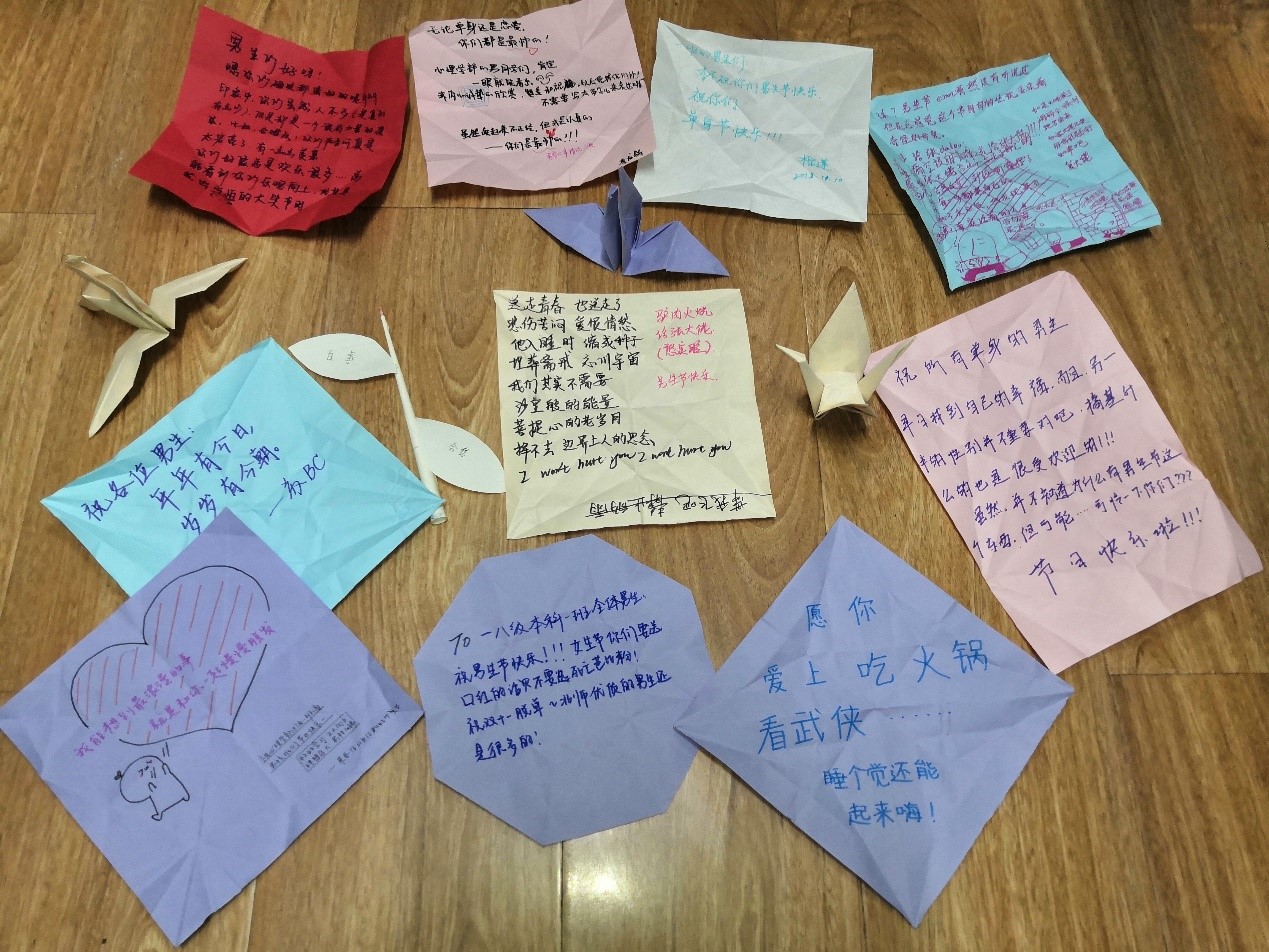 虽然开学已经两月有余,但由于本身班级人数众多,中间又有军训的安排,仍有班级同学还没有和所有同学熟悉。为了增进班级同学感情,建设和睦班级氛围,提升班级凝聚力,在11月10日,男生节的晚上,1班女生为只占少数的同班男生们,送上了特别的祝福。 活动开始,班长和组织委员先进行了简短的发言。在班长和组委的简短发言后,所有人展开了积极热烈的互动。 此时,组织委员拿出女生为男生准备的贺卡,不得不说令在场的所有男生震撼。或花、或飞机、或千纸鹤,造型各异,令男生们十分佩服女生们的心灵手巧。一张一张地拆开,此中真情令每个一班人感慨、感动、感叹。 让我们通过图片感受一下一班人的真情。 最后,在大家的提议下,进行了一场激烈与宁静并存、有趣而又诡异的狼人杀,最终平民离奇获胜。 本次活动圆满结束,同学们欢聚一堂,一个半小时的时间里,同学们有说有笑有吃有玩有趣有意义。很多同学从彼此只知道一个姓名的阶段过渡到了熟人阶段,增进了彼此的了解,一起度过了一个美好的夜晚。 |