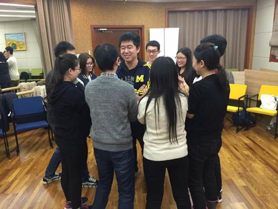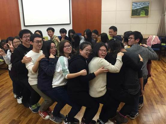 接着,活动现场的同学分为三组,通过同伴互识、组内认识、组间展示这三个逐步递进的环节,加深了全体同学的相互认识。另外,三个小组还各自制定了自己的队名和口号。 在大家相互熟悉后,分小组进行了“疾风劲草”游戏,这个游戏中,小组成员相互信任、相互协作,大家纷纷表示,在活动中体会到了信任他人和被他人信任的喜悦感,感受到了一个有凝聚力的团体带来的力量。