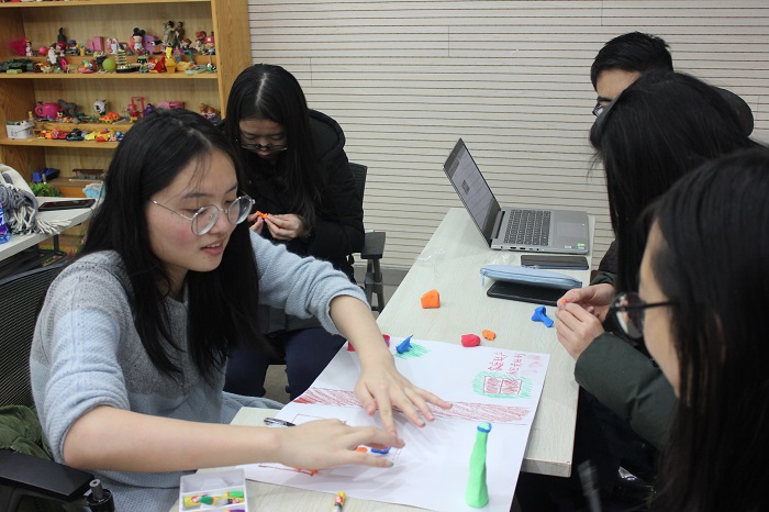 会议一开始,支部的同学们一起合唱国际歌。范卓仪同志向大家强调了思想汇报的撰写要求,以及读书会的相关事宜。之后,同学们分成7个小组,每个小组用刮画、彩笔、蜡笔、粘土等自己喜欢的展现形式,生动地描绘了改革开放前后在衣、食、住、行等方面发生的变化。