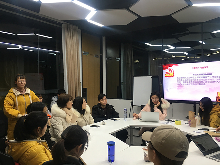 之后会议继续由乔亚澜主持进行——《中国共产党支部工作条例(试行)》专题学习会。我们看了两个视频,一是中共中央政治局召开会议审议《中国产党支部工作条例(试行)》,另一个是中共中央印发《中国共产党支部工作条例(试行)》。看完学习视频后,第十三党支部的同志们又进行了学习心得的交流,党员徐静同志和赵金同志起来发言了条例的重要意义以及条例里党支部的工作内容;积极分子符薇和张曼玉同志也起来说了一些《条例》里的内容学习。