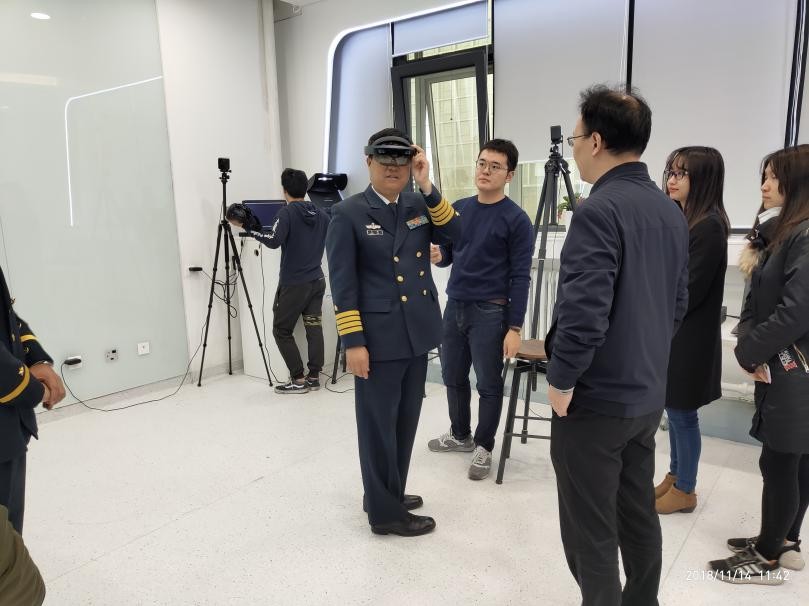 图1 海政干部局领导来访调研赛客双创空间 图2 王军同志体验赛客双创空间人机交互实验室系统设备 图3 王军同志体验赛客双创空间虚拟现实设备