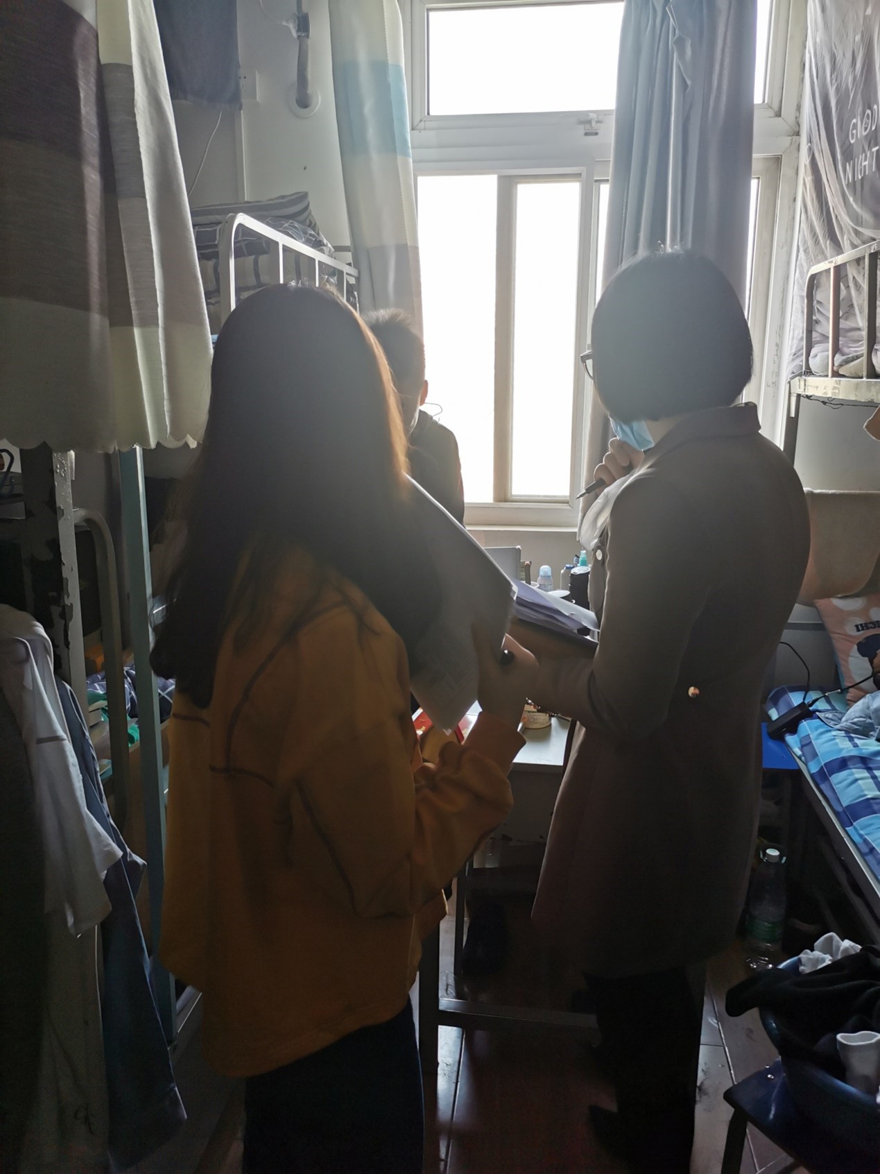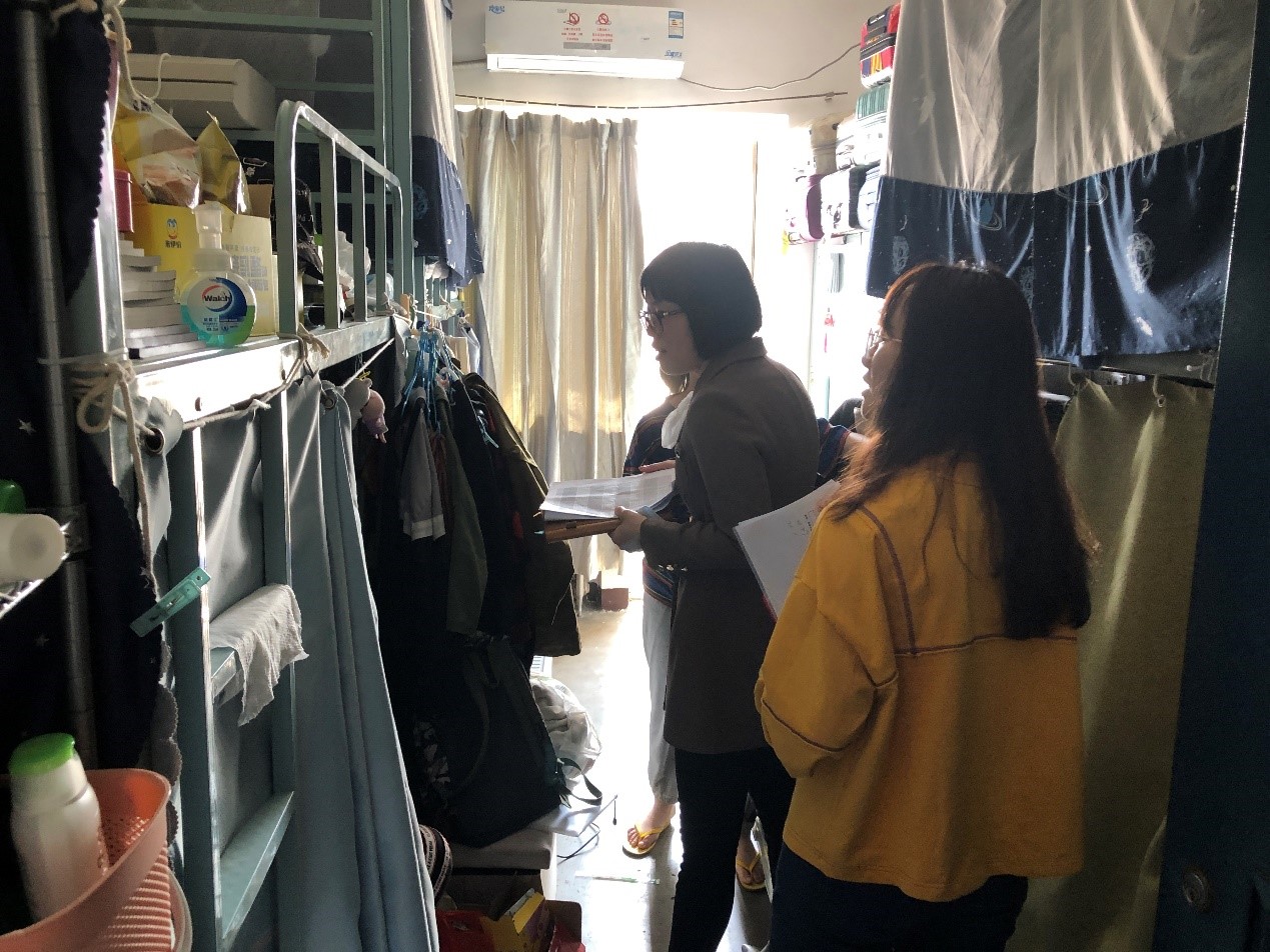 2021年3月25日上午,成人视频 2018级本科生班主任黄利老师和周以铭老师依次走访了年级女生宿舍和男生宿舍,对年级两班宿舍的卫生及安全进行检查,以排除安全隐患,同时了解同学们近期动态。两个班的部分班委也一同走访并协助。 本次走访检查的重点是宿舍的卫生与安全情况。在检查过程中,两位老师在班委的协助下,认真检查、仔细记录,提醒在宿舍的同学出门时一定要断电,并且要经常打扫卫生,保持宿舍整洁等。在宿舍的同学们也积极配合老师的检查工作,认真倾听老师的点评,记录并改正宿舍中做的不好的地方。 健康、满意的住宿生活离不开良好的宿舍卫生情况。在本次走访检查中,女生宿舍506、517、528和男生宿舍311的宿舍卫生情况较好,房间较为干净整洁,值得学习。希望同学们在本次检查结束后也不忘保持宿舍卫生整洁,同时注意宿舍活动安全,为自己创造一个舒适安全的生活环境! (成人视频 2018级本科1、2班班委)
